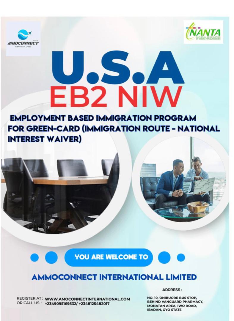 Relocate to United State of America with an Employment based National interest waivers permanent residency from your home country with your family. Contact us on 234.90.95.16.95.32/2348125482017